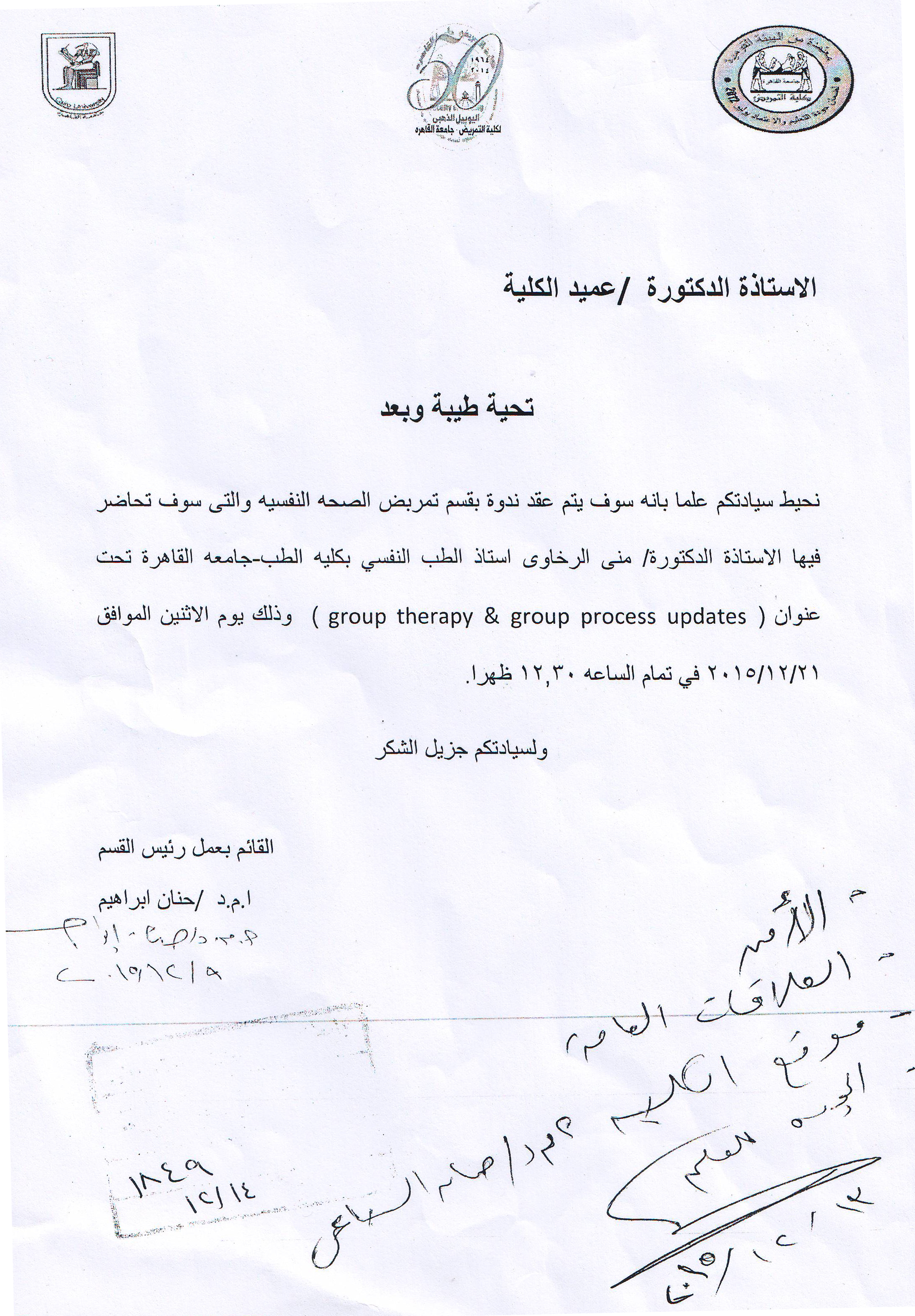سيتم عقد ندوة بقسم الصحة النفسية يوم 21/12/2015 الموافق الآثنين تحت عنوان (Group Therapy & Group Process Updates)