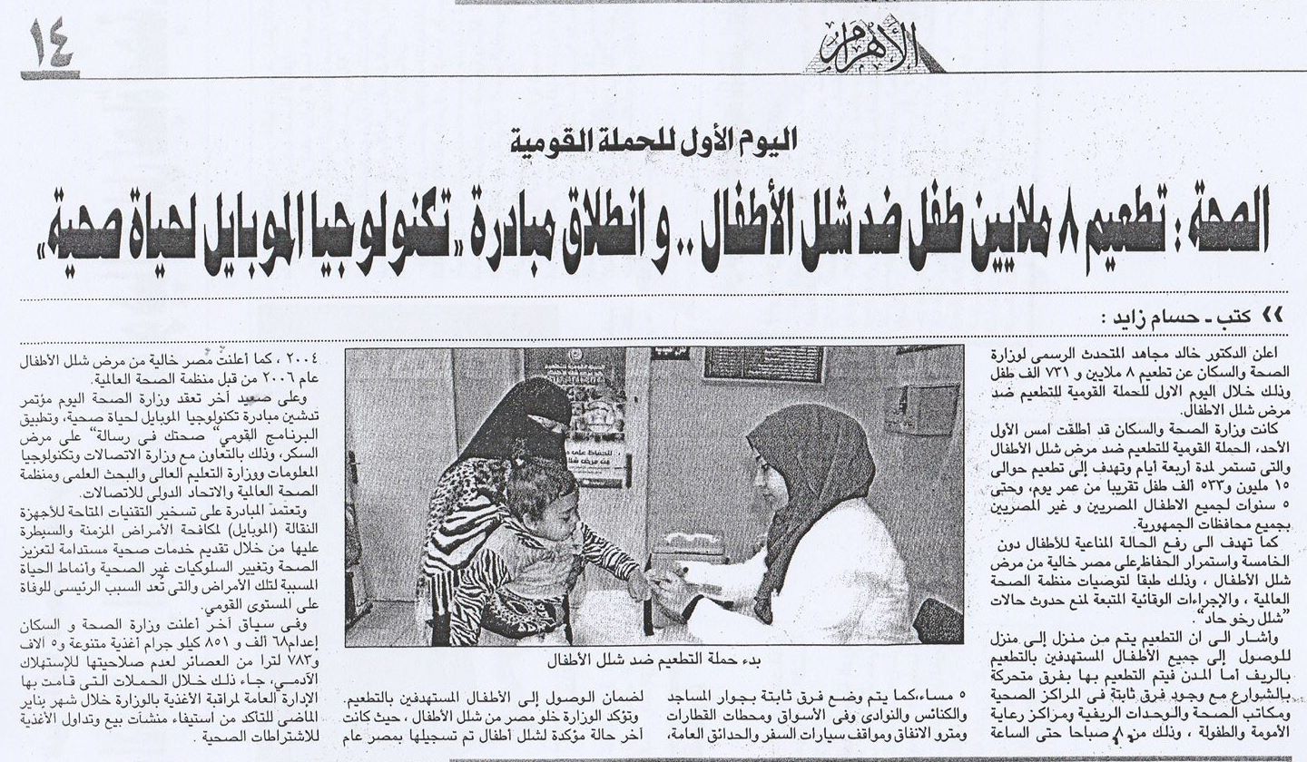 وزارة الصحة : تطعيم 8 مليون طفل ضد شلل الآطفال .. وإنطلاق مبادرة ” تكنولوجيا الموبايل لحياة صحية “