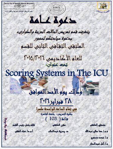 يتشرف قسم تمريض الحالات الحرجة والطوارئ بدعوة سيادتكم لحضور الملتقى الثقافى الثانى للعام الجامعي 2016/2015 تحت عنوان ” Scoring Sustems In The ICU “