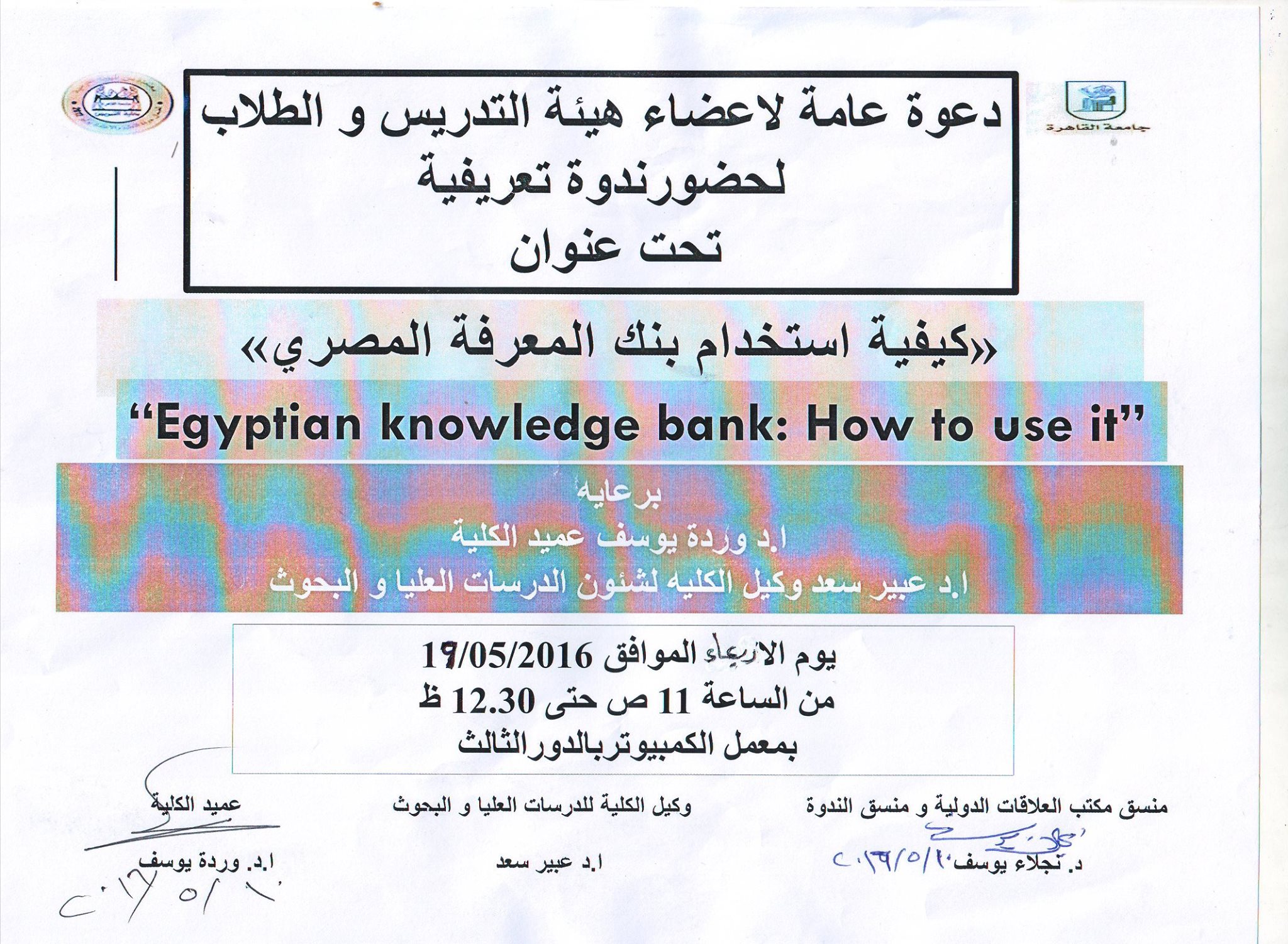 دعوة عامة لاعضاء هيئة التدريس والطلاب لحضورة ندوة تعريفية عن كيفية استخدام بنك المعرفة المصرى بالكلية