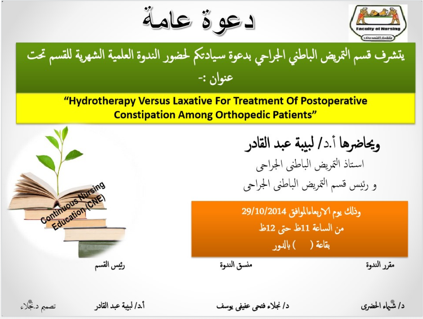 عنوان الورشة | Hydrotherapy Versus laxative For Treatment Of Postoperative Constipation Among Orthopedic Patients