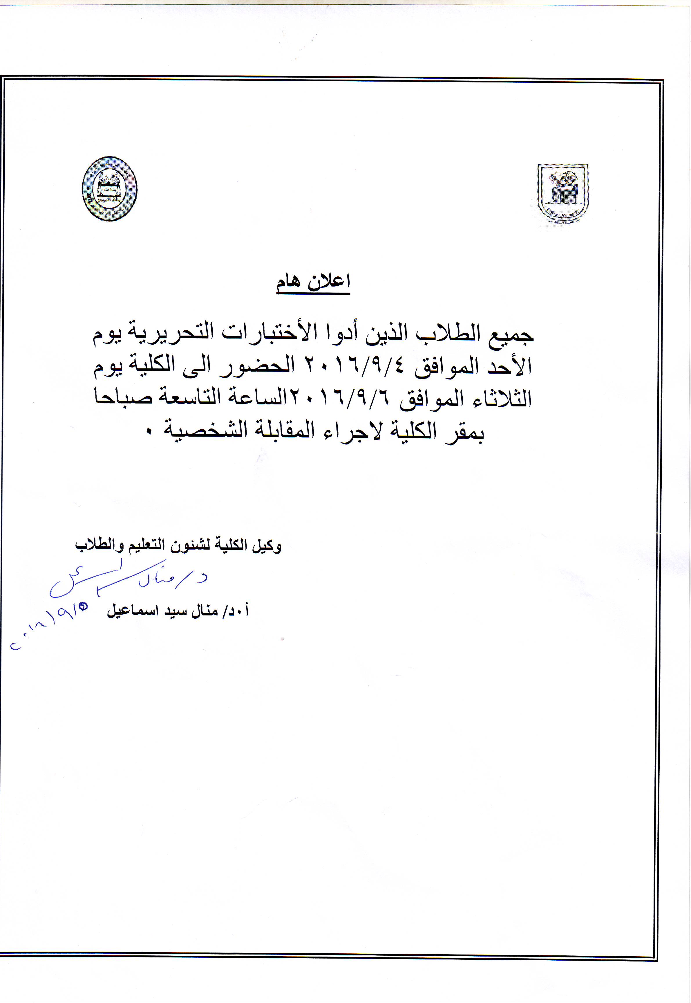 إعلان | جميع الطلاب الذين أدوا الإختبارات التحريرية الآحد 2016/9/4 – الحضور بالكلية يوم الثلاثاء 2016/9/6
