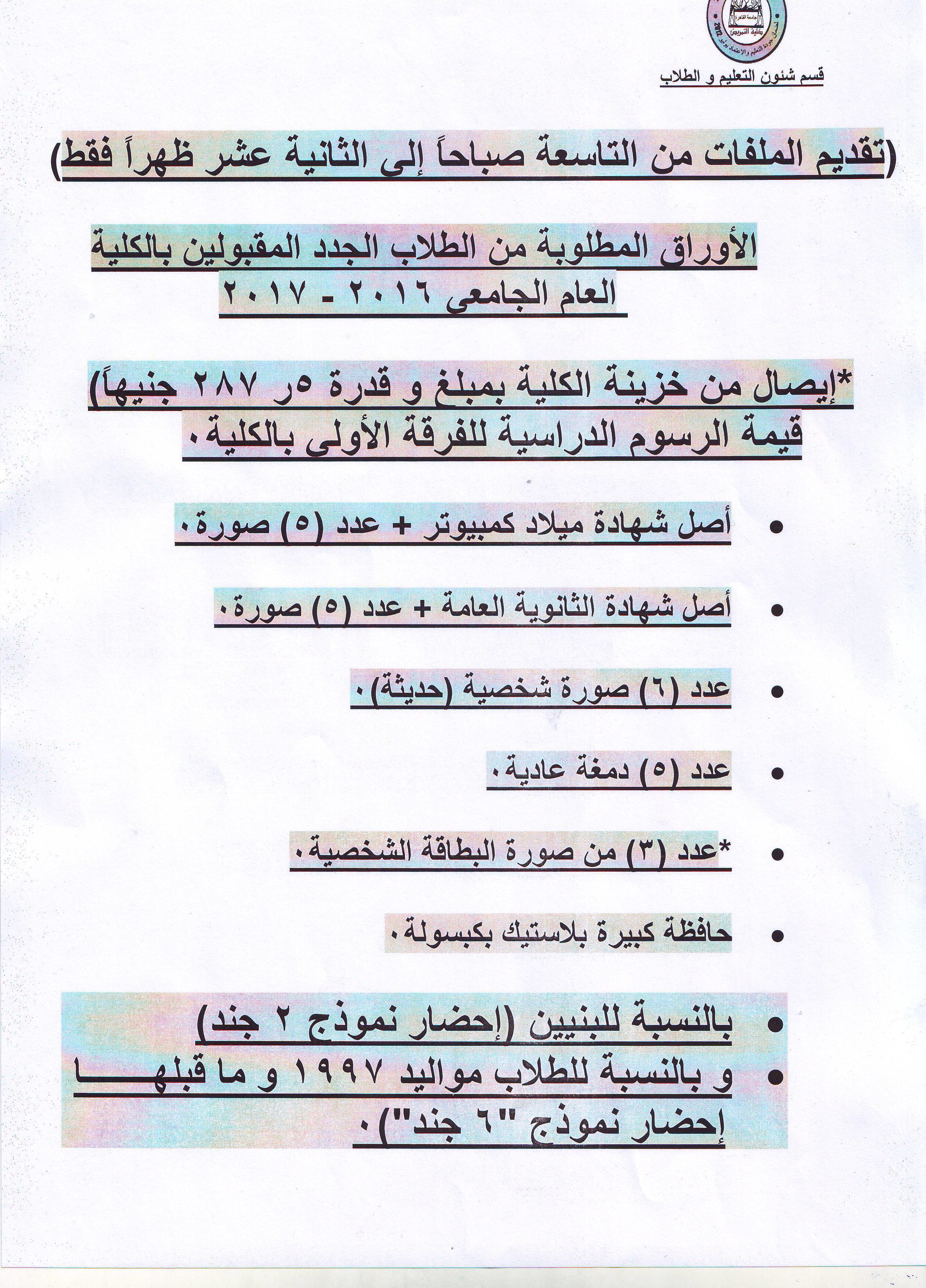 الآوراق المطلوبة من الطلاب الجدد المقبولين بالكلية للعام الجامعي 2017/2016
