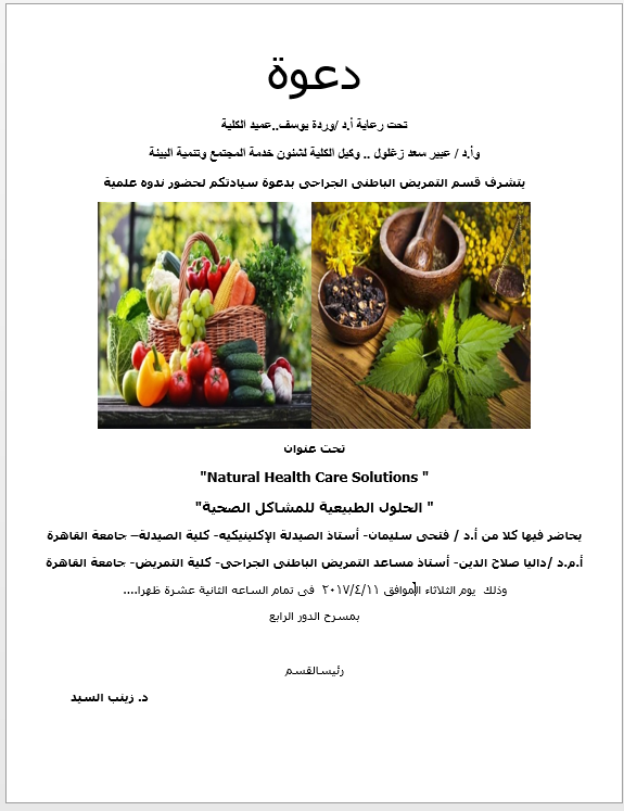 يتشرف قسم التمريض الباطنى الجراحى بدعوة سيادتكم لحضور ندوه علمية