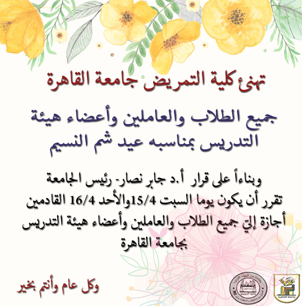 وبناءاً على قرار أ.د جابر نصار- رئيس الجامعة تقرر أن يكون يوما السبت 15/4والأحد 16/4 القادمين أجازة إليّ جميع الطلاب والعاملين وأعضاء هيئة التدريس بجامعة القاهرة القاهرة – وكل عام وأنتم بخير