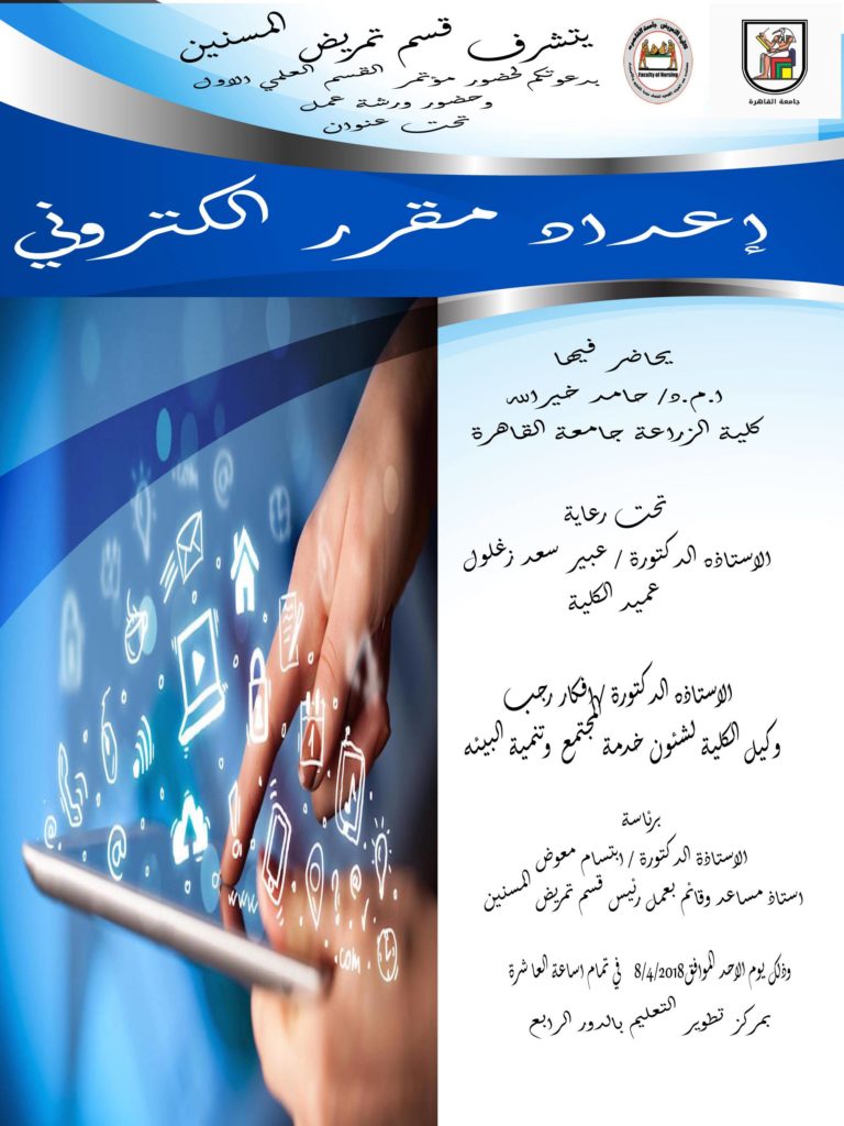 الرئيسية»أخر الاخبار»يتشرف قسم التمريض المسنين بدعوتكم لحضور مؤتمر القسم العلمى الاول تحت عنوان إعداد مقرر إلكتروني