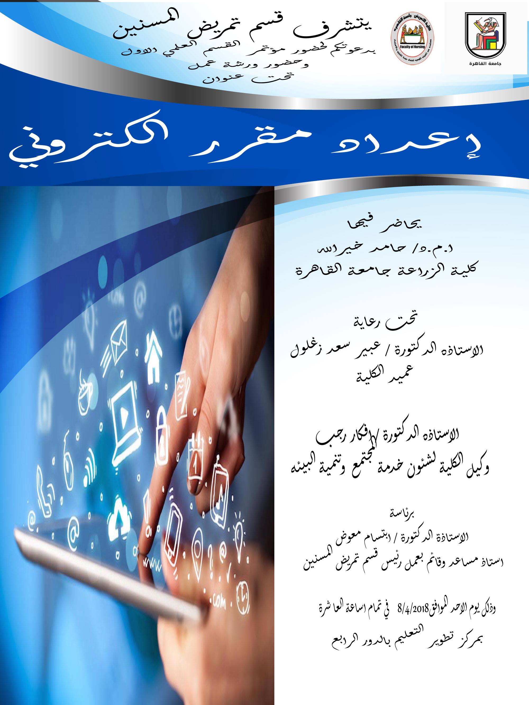يتشرف قسم التمريض المسنين بدعوتكم لحضور مؤتمر القسم العلمى الاول تحت عنوان إعداد مقرر إلكتروني