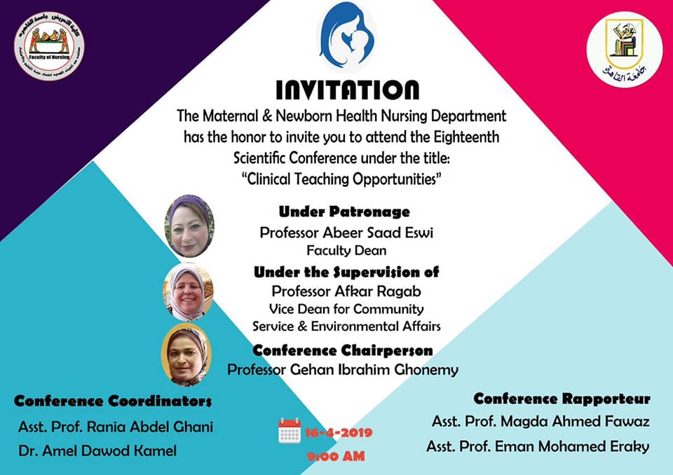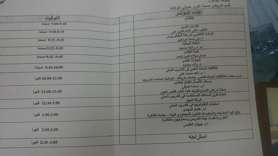 المزمن انعقاده يوم الثلاثاء الموافق 16_4_2019 كل الساعة التاسعة صباحا وسوف نتشرف ان يحاضر فية اد ناهد محمد علي نائب رئيس جامعة قناة السويس ومدرب معتمد في اخلاقيات البحث العلمي اد اسامة شوقي استاذ امراض النساء والتوليد بالقصر العيني وباعة العلمي في محاضرات التنمية البشرية و اد هشام المهدي وكيل كلية حاسبات ومعلومات جامعة القاهرة وعرض احدث وسائل المحاكة للتعليم العملي للطلاب من شركة الجيل يسعدنا حضوركم