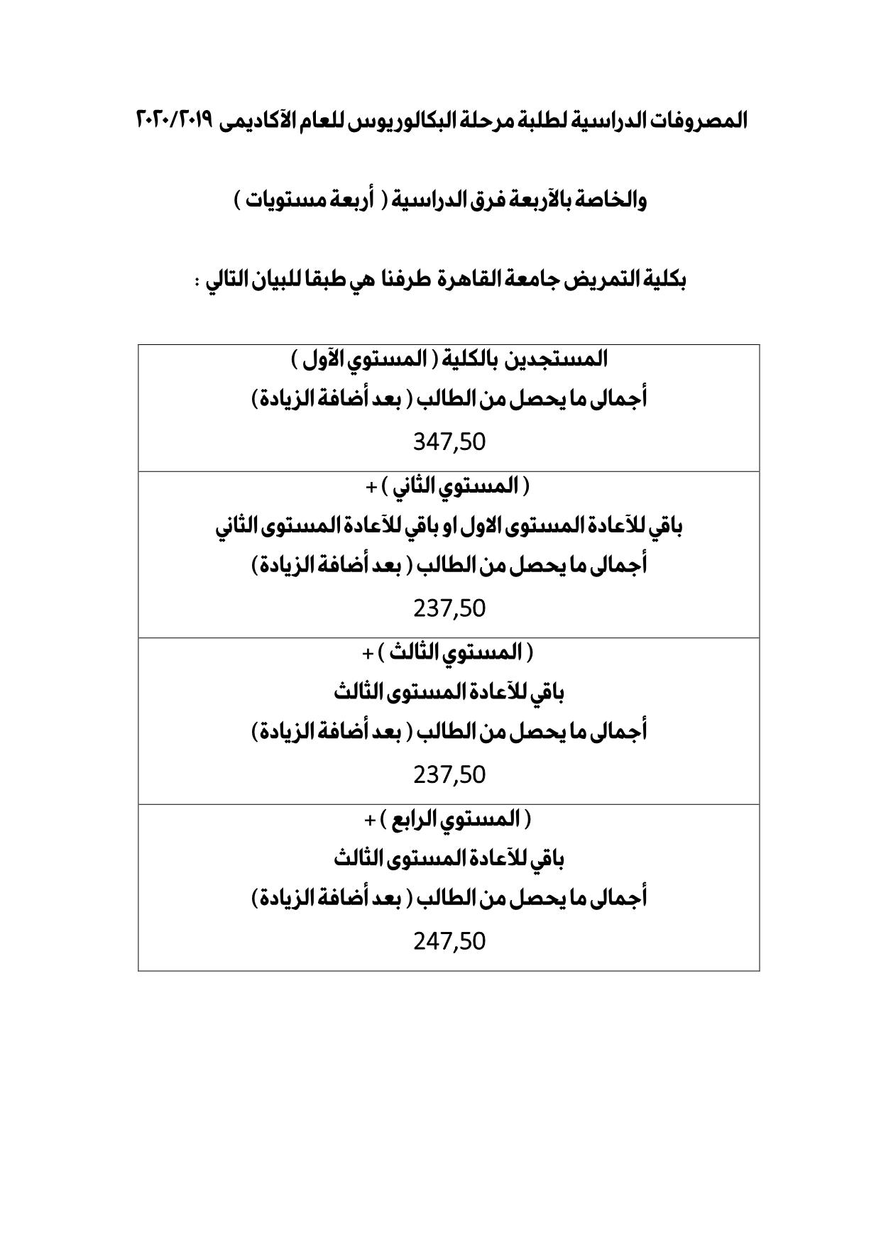 المصروفات الدراسية لطلبة مرحلة البكالوريوس للعام الآكاديمى 2020/2019 والخاصة بالآربعة فرق الدراسية ( أربعة مستويات ) نشرت بواسطة: admin في أخبار الكلية, أخر الاخبار, أنشطة وفعاليات, الاحداث الهامة و الاعلانات 15 سبتمبر، 2019 التعليقات على المصروفات الدراسية لطلبة مرحلة البكالوريوس للعام الآكاديمى 2020/2019 والخاصة بالآربعة فرق الدراسية ( أربعة مستويات ) مغلقة 1,508 زيارة بكلية التمريض جامعة القاهرة طرفنا هي طبقا للبيان التالي : 2019-09-15 admin tweet