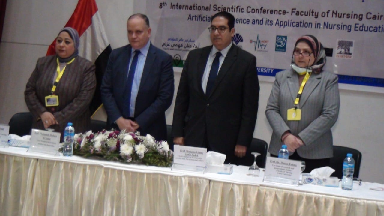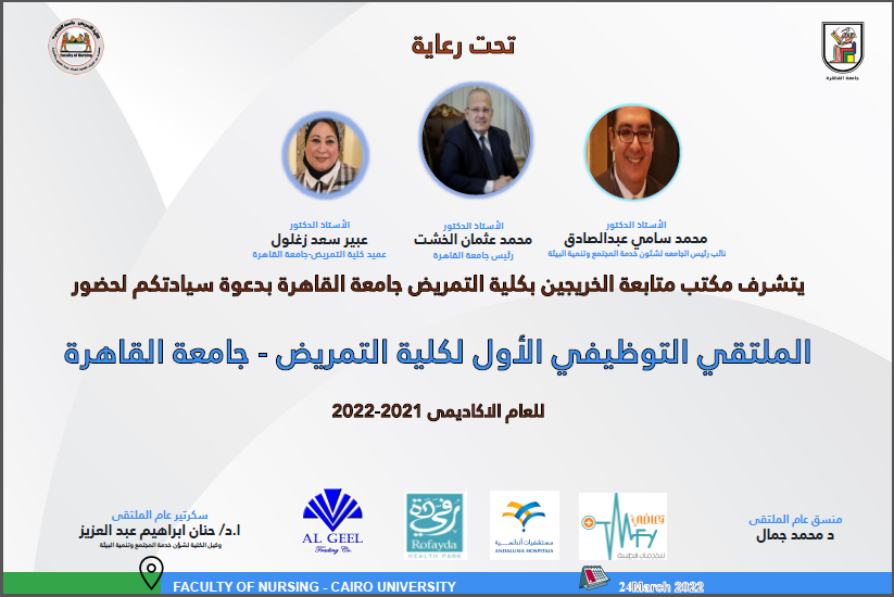 و تحت اشراف ا.د حنان فهمي عزام وكيل الكليه لشئون الدراسات العليا و البحوث و سكرتير عام المؤتمر و بحضور و تشريف ا.د محمد سامي عبد الصادق نائب رئيس الجامعه لشئون خدمه المجتمع وتنميه البئيه و ا.د محمد محسن العطار نائب رئيس الجامعه لشئون الدراسات العليا و البحوث و لفيف من الساده عمداء جامعه القاهره و عمداء التمريض و قيادات التمريض من قطاع الخدمات الطبيه بوزاره الدفاع و وزاره الداخليه و عمداء المعاهد الفنيه