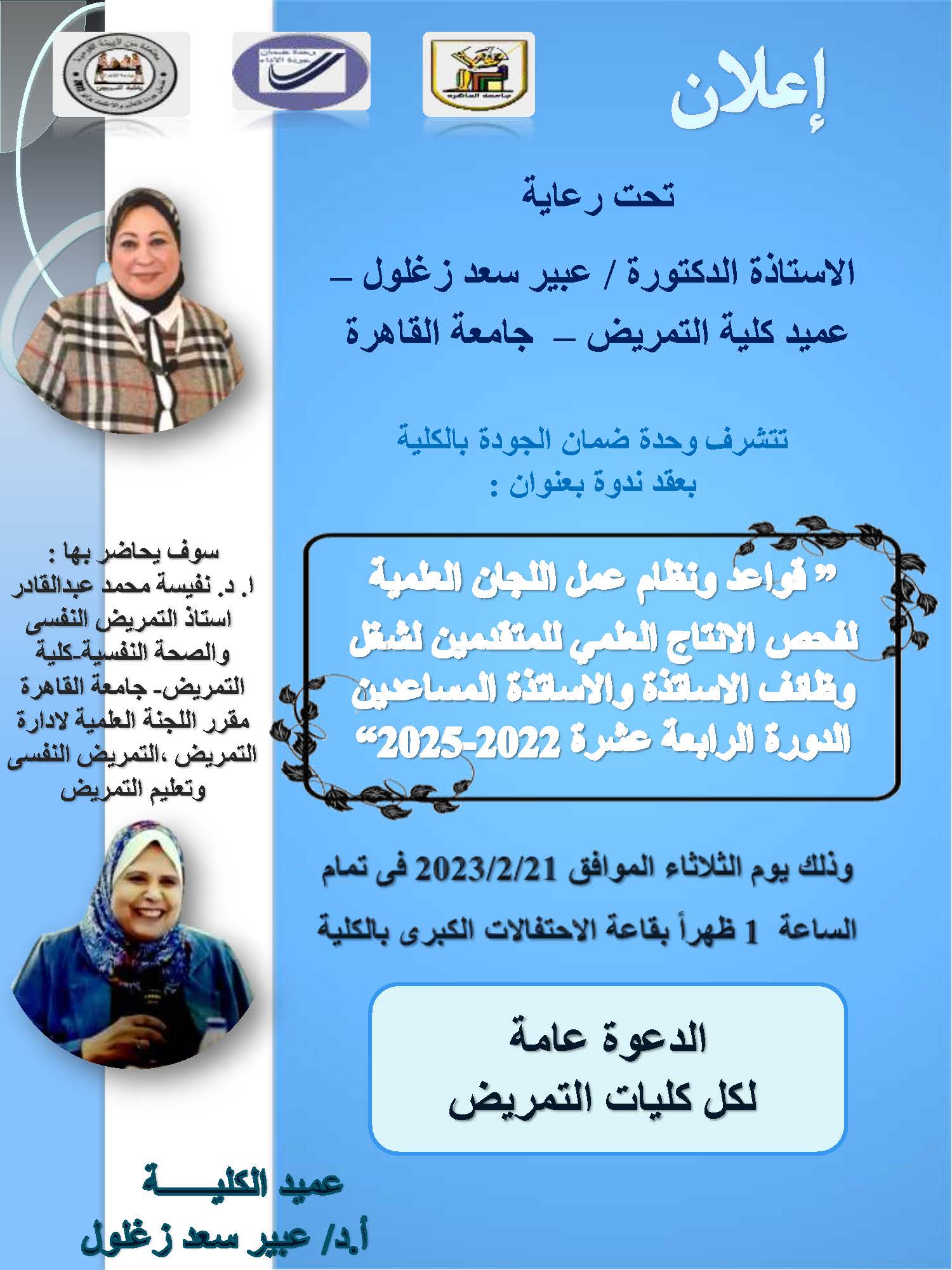 المتقدمين للجان العملية للترقي لدرجة استاذ مساعد ودرجة استاذ وكذلك نظرا للدور الريادي لجامعة القاهرة تم عقد الندوة العلمية الخاصة بقواعد الترقيات الدورة ١٤ وقد حاضر بها ا. د. نفيسة محمد عبدالقادر استاذ التمريض النفسى والصحة النفسية و مقرر اللجنة العلمية لادارة التمريض ، التمريض النفسى ،تعليم التمريض