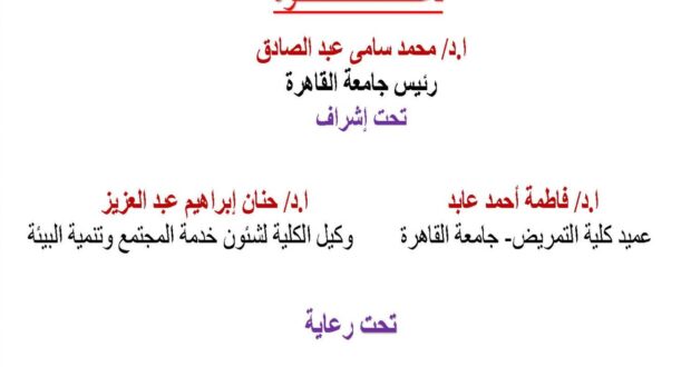 تحت رعاية أ.د / محمد سامي عبد الصادق رئيس جامعة القاهرة أ.د / احمد رجب نائب رئيس الجامعة لشئون التعليم والطلاب أ.د/ فاطمة احمد عابد عميد كلية التمريض أ.د/ حنان إبراهيم وكيل الكلية لشئون المجتمع وتنمية البيئة ” تعقد كلية التمريض جامعة القاهرة ندوة بعنوان” انتصارات اكتوبر و بناء المستقبل يحاضرها اللواء / رمضان السيد احمد رئيس سلاح حرس الحدود ...