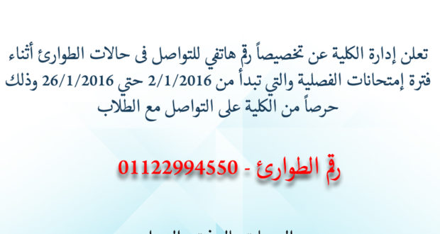 تعلن إدارة الكلية عن تخصيصاً رقم هاتفي للتواصل فى حالات الطوارئ أثناء فترة إمتحانات الفصلية والتي تبداً من 2/1/2106 – حتى 26/1/2016 حرصاً من الكلية على التواصل مع الطلاب رقم الطوارئ – 01122994550