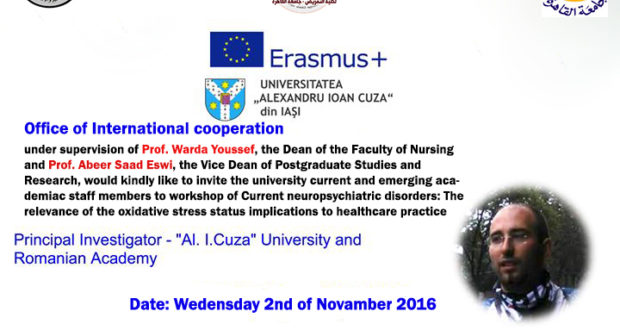 To Workshop Office of International cooperation, under supervision of Prof. Warda Youssef, the Dean of the Faculty of Nursing and Prof. Abeer Saad Eswi, the Vice Dean of Postgraduate Studies and Research, would kindly like to invite the university current and emerging academiac staff members to workshop of Current neuropsychiatric disorders: The relevance of the oxidative stress status implications to ...