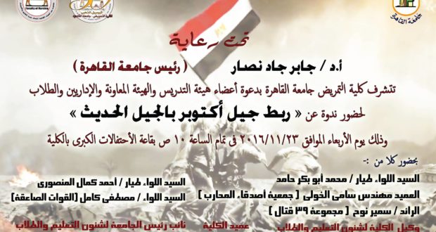 تحت رعاية أ.د / جابر نصار (رئيس جامعة القاهرة) وبحضور كلا من العميد مهندس سامى الخولى ( جمعية أصدقاء المحارب ) الرائد / سمير نوح ( مجموعة 93 قتال ) السيد اللواء طيار / محمد ابو بكر حامد السيد اللواء طيار / أحمد كمال المنصورى السيد اللواء / مصطفى كامل (القوات الصاعقة) ...