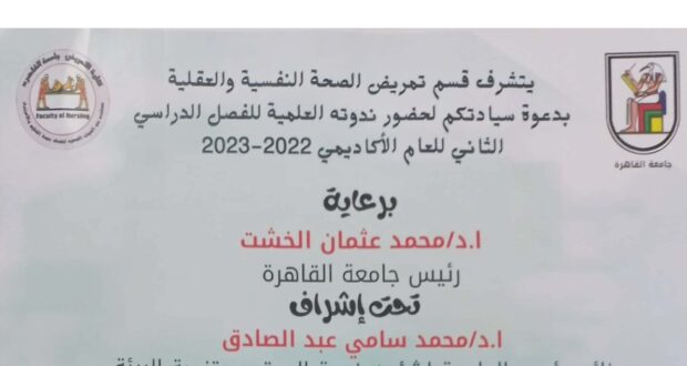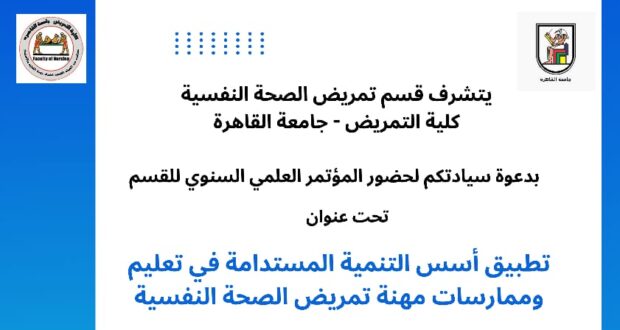 بدعوة سيادتكم لحضور المؤتمر العلمي السنوي الثامن عشر للكلية تحت عنوان تطبيق اسس التنمية المستدامة في تعليم وممارسات مهنة التمريض