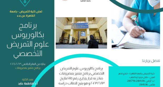 برنامج متميز بمصروفات صادر به قرار وزاري رقم ١٠٧٥ بتاريخ ٢٠٢٣/٦/١٣ و هو يتيح للطالب دراسه تخصص عند وصوله المستوي الرابع وحصوله على شهادة بالمقررات التي درسها و عدد الساعات المعتمد تعلن كلية التمريض – جامعة القاهرة عن بدء برنامج بكالوريوس علوم التمريض التخصصي بداية من العام الجامعي ٢٠٢٣-٢٠٢٤ برنامج متميز بمصروفات عميد الكلية أ.د/ فاطمة عابد